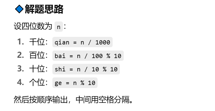 #include <iostream> using namespace std; int main() { int n; cin >> n; int qian = n / 1000; int bai = n / 100 % 10; int shi = n / 10 % 10; int ge = n % 10; cout << qian << " " << bai << " " << shi << " " << ge << endl; return 0; }