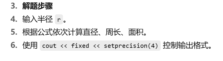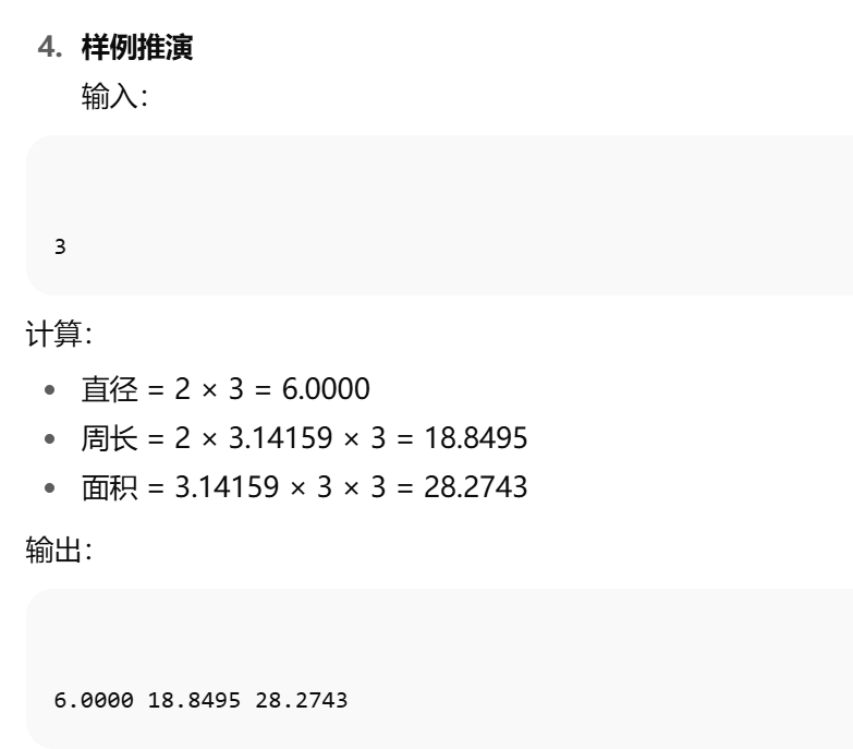 题目分析 输入一个实数半径 𝑟 π=3.14159。