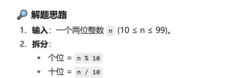 int n; cin >> n; // 输入两位数 int shi = n / 10; // 十位 int ge = n % 10; // 个位 cout << ge<<shi ;