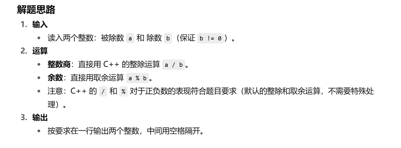 int a, b; cin >> a >> b; cout << a / b << " " << a % b << endl;