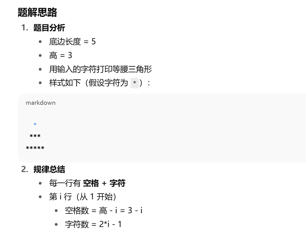 char ch; cin >> ch; int height = 3; // 高度 for (int i = 1; i <= height; i++) { // 打印空格 for (int j = 0; j < height - i; j++) cout << ' '; // 打印字符 for (int j = 0; j < 2*i - 1; j++) cout << ch; cout << endl; }