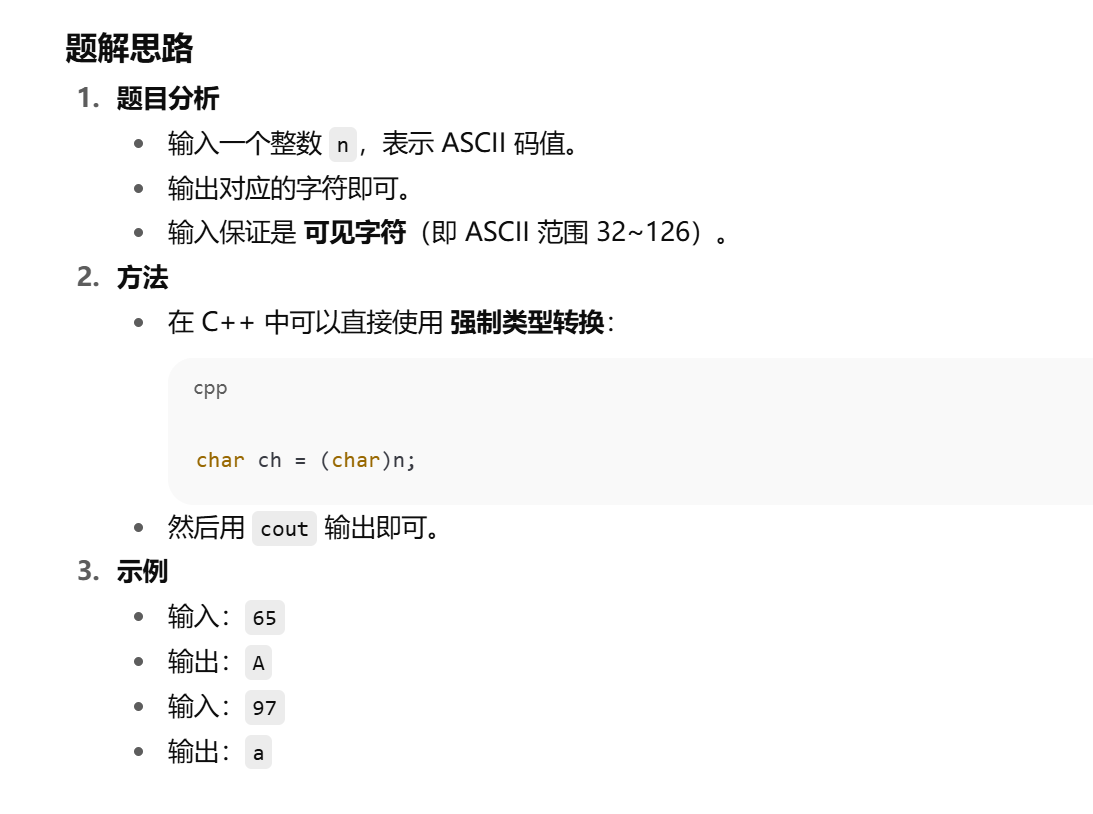 int ascii; cin >> ascii; char ch = (char)ascii; // 强制类型转换为字符 cout << ch << endl;