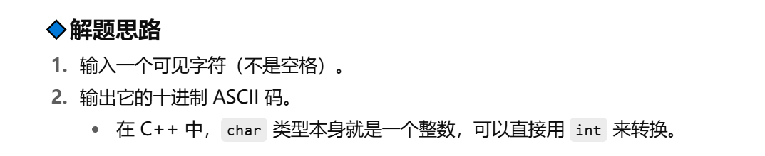 char ch; cin >> ch; // 输入字符 cout << (int)ch; // 输出字符对应的ASCII码