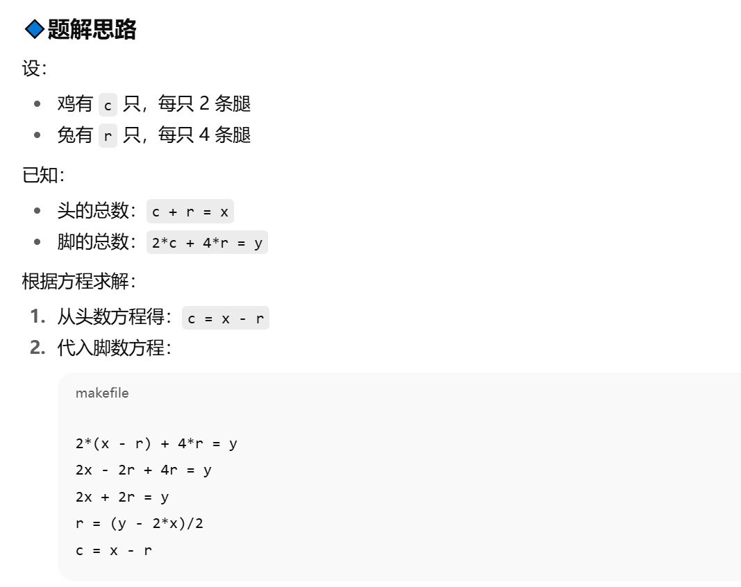 #include <iostream> using namespace std; int main() { int x, y; cin >> x >> y; int r = (y - 2 * x) / 2; // 兔的数量 int c = x - r; // 鸡的数量 cout << c << " " << r << endl; return 0; }